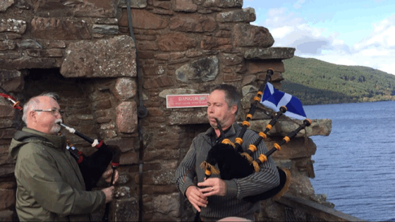Es muy posible que en tu viaje no encuentres a Nessie, pero al menos te recibirán este par de gaiteros tan simpáticos.